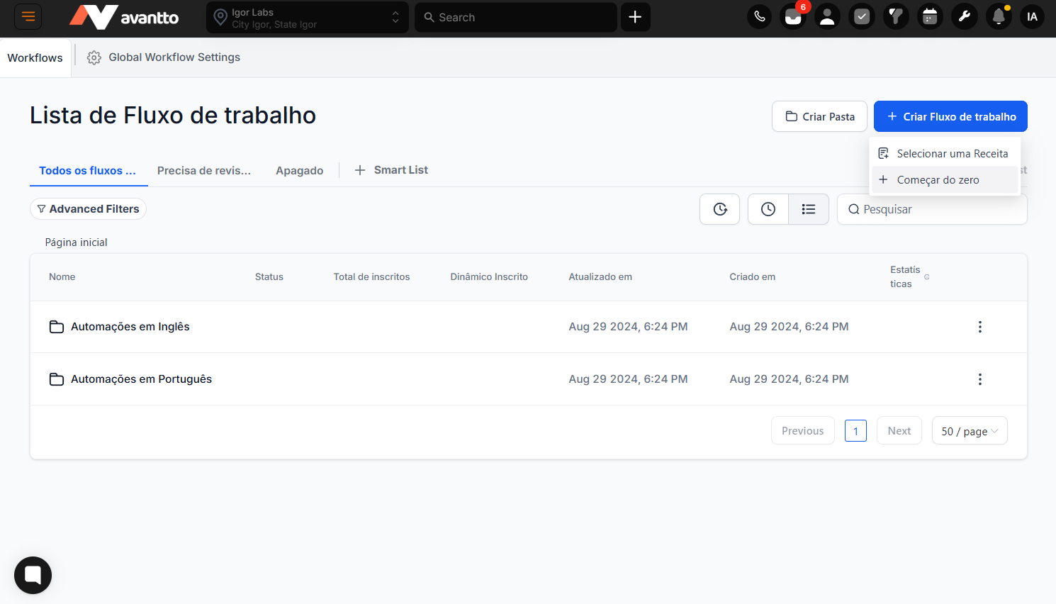 Para começar, vá até a seção Automação no Avantto. É aqui que você gerencia e cria todos os seus fluxos de trabalho. Você pode clicar em + Adicionar Novo Fluxo de Trabalho para começar do zero ou selecionar um fluxo de trabalho existente onde deseja adicionar a ação de conversão do Google Ads.