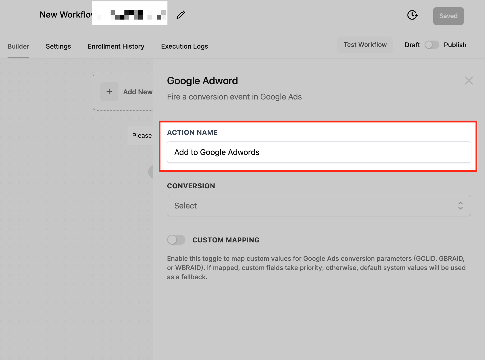 Ative o botão de Mapeamento Personalizado se quiser mapear manualmente parâmetros específicos de conversão do Google Ads (como GCLID, GBRAID ou WBRAID) para campos dentro do seu fluxo de trabalho. Isso é útil quando você está trabalhando com campos personalizados ou deseja mais controle detalhado sobre como o ID de clique é enviado de volta para o Google Ads.