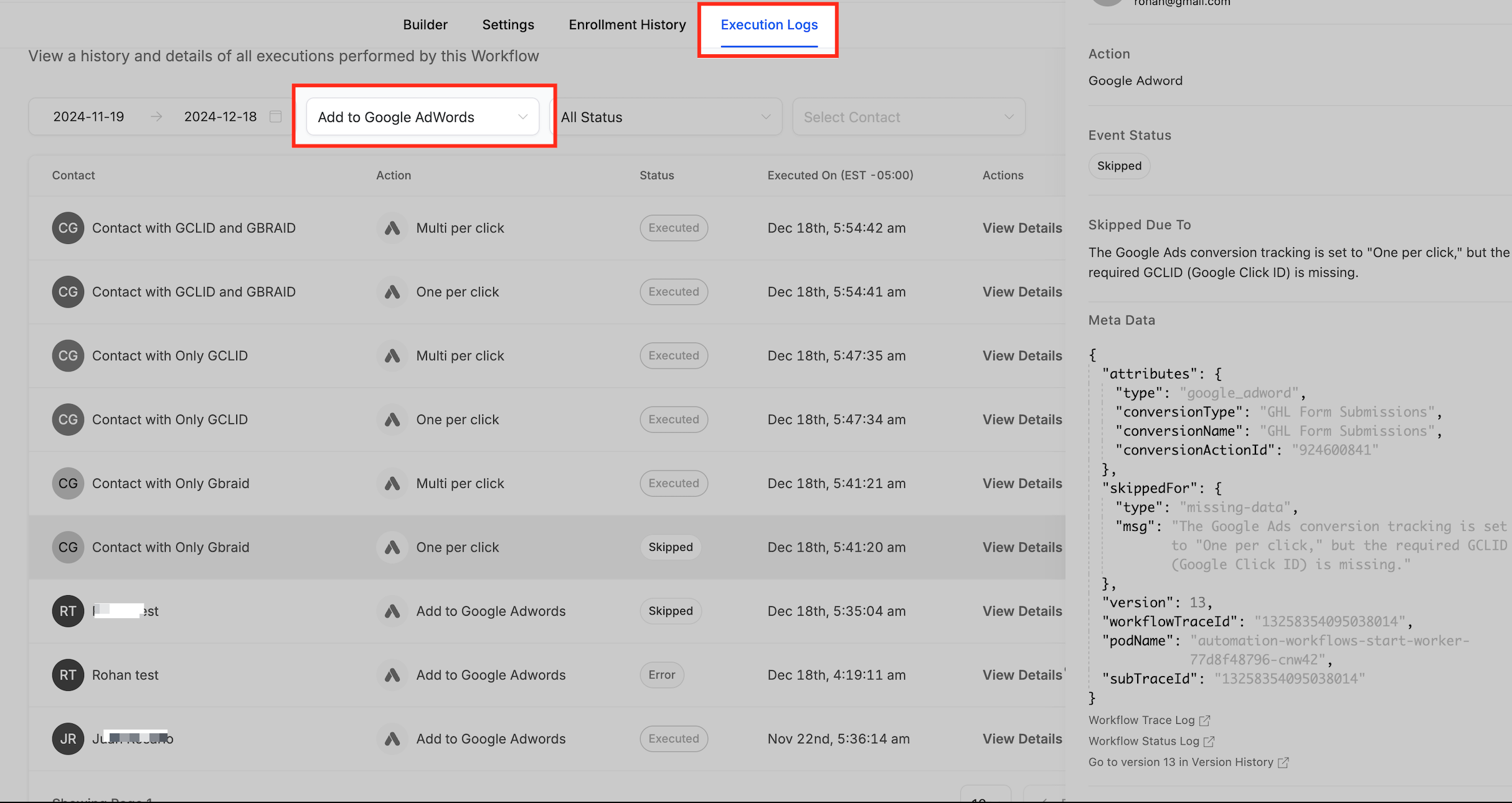 Vá para a aba Logs de Execução dentro do fluxo de trabalho. Procure pela ação “Adicionar ao Google AdWords” e seu resultado: