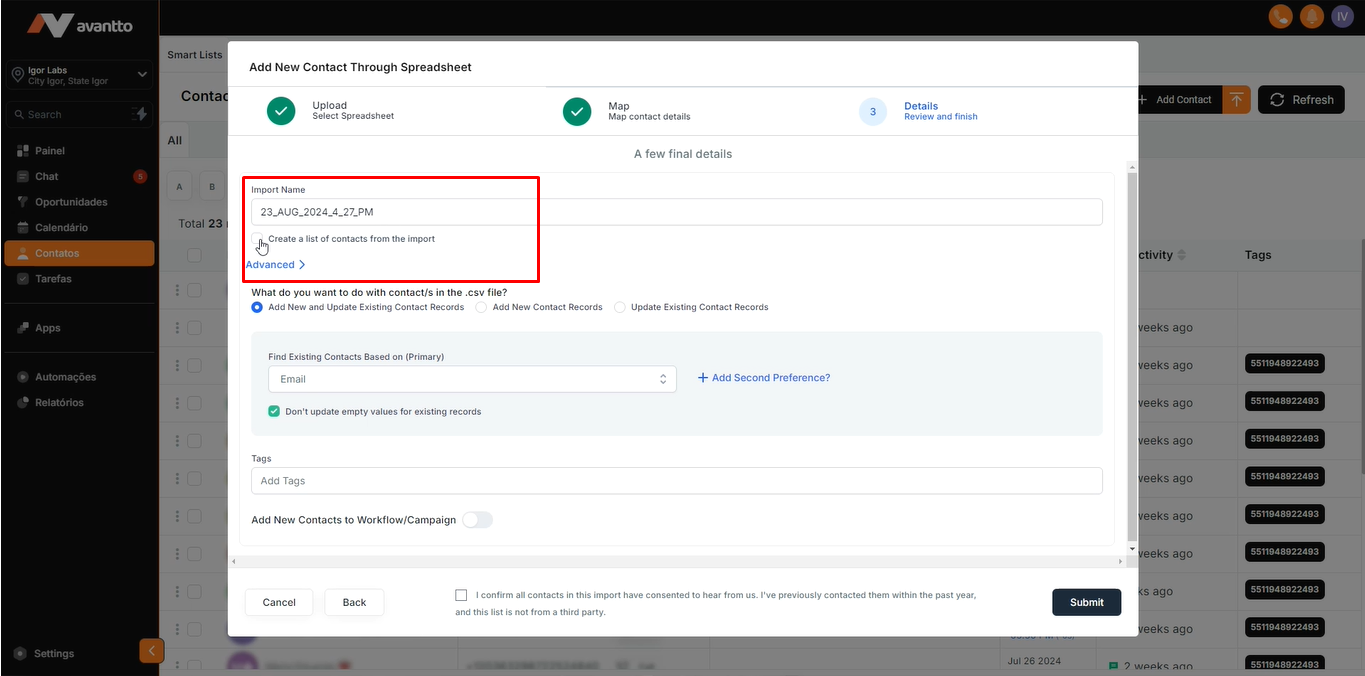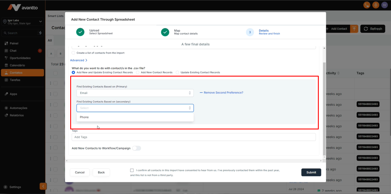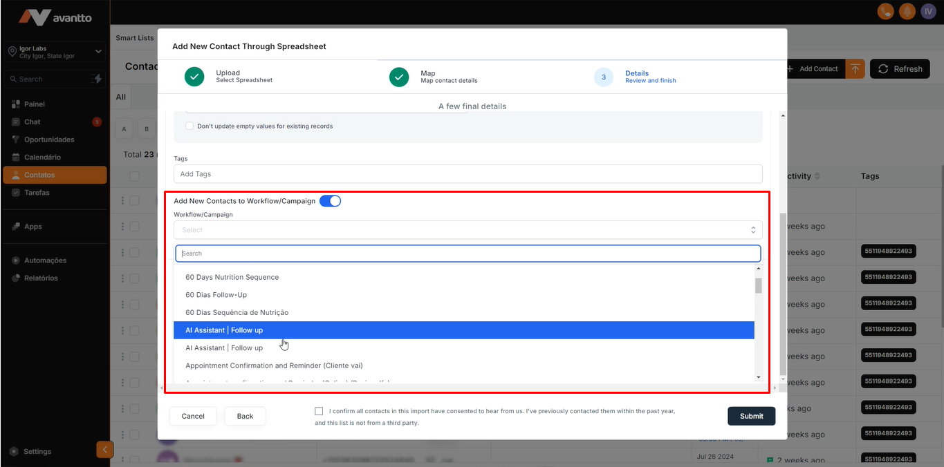 A opção "Add New Contact to Workflow/Campaign" permite que você adicione diretamente os contatos que estão sendo importados a uma automação já criada e ativa dentro da Avantto. Isso facilita a inclusão imediata dos novos contatos nas campanhas ou fluxos de trabalho existentes.