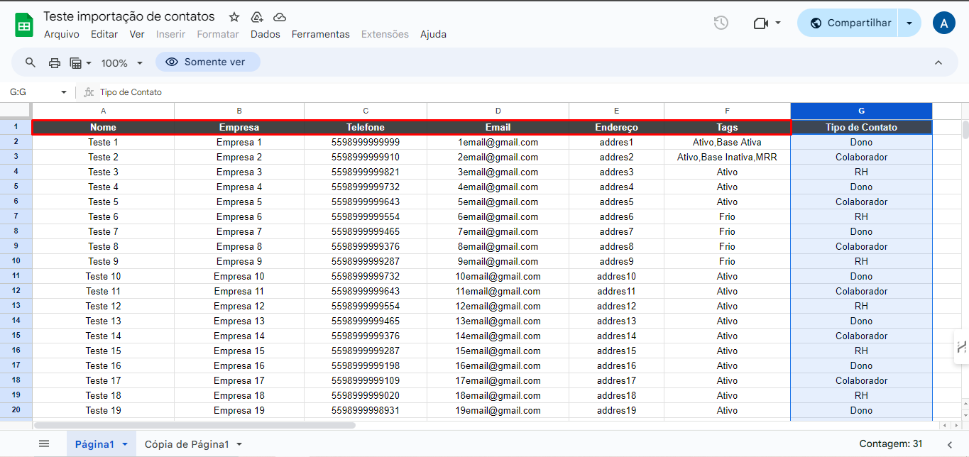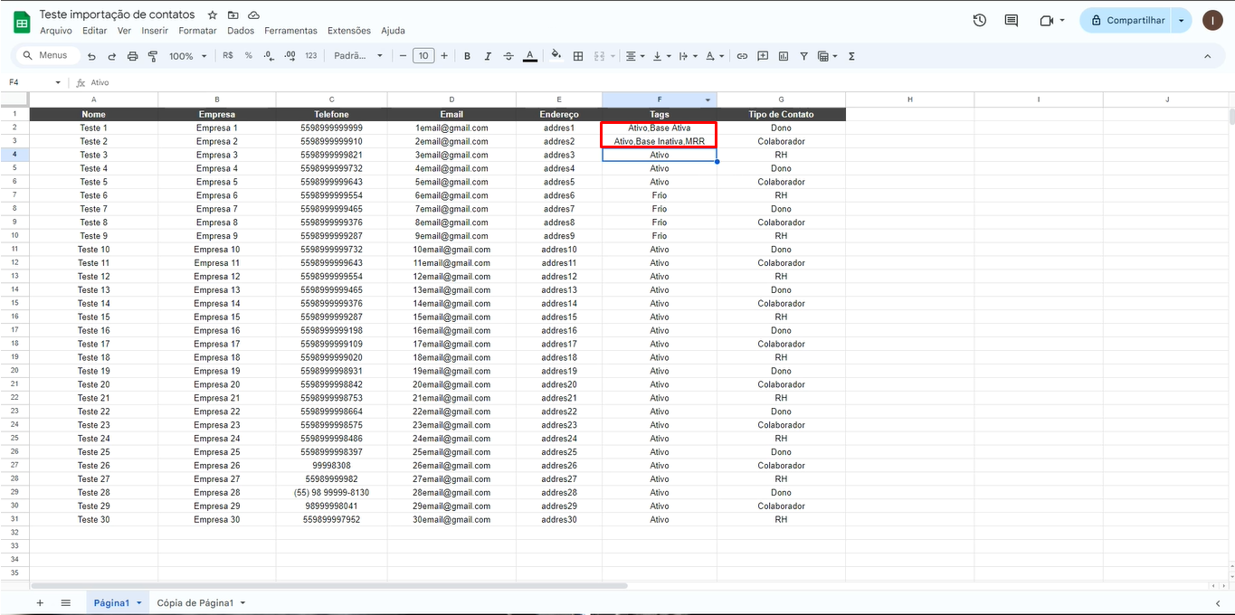 Para a criação de Tags é mais prático e personalizável adicionar tags manualmente dentro da planilha, pois na Avantto só é possível atribuir uma única tag para todos os contatos. Por exemplo, na imagem, as tags foram utilizadas para identificar clientes ativos e frios. No entanto, você pode adicionar mais tags, desde que sejam separadas por vírgula e não contenham espaços, como em "ativo, base inativa, MMR". Assim, o contato será importado com essas tags.