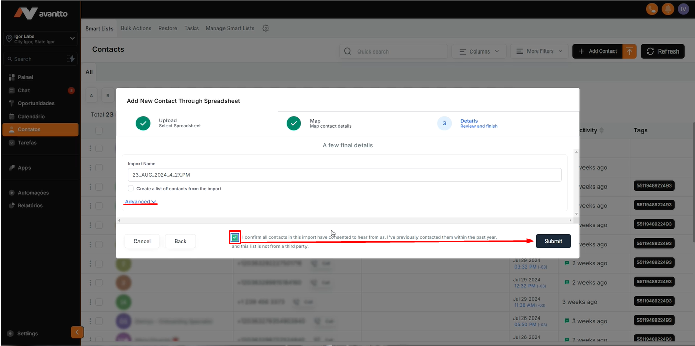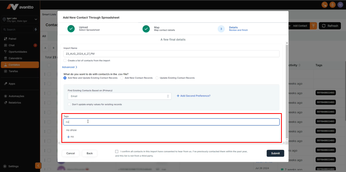 Este guia aborda o processo de tratamento e importação de contatos na plataforma Avantto, essencial para garantir a qualidade e relevância da base de dados. O procedimento começa com a necessidade de padronização dos campos, especialmente no que diz respeito ao "Tipo de Contato", que é personalizável e pode ser importado com valores predefinidos. A falta de padronização nos números de telefone pode causar erros durante a importação, sendo crucial que o arquivo esteja no formato .CSV, com um limite de até 50 MB. A importação é iniciada acessando a opção "Import Contacts" e selecionando o arquivo desejado. Em seguida, os campos da planilha devem ser conectados aos campos correspondentes na Avantto, seguido pela confirmação da importação. O usuário também pode adicionar tags para categorizar os contatos e escolher como lidar com duplicatas durante o processo. Após a importação, é importante verificar o status e possíveis erros, permitindo que ajustes sejam feitos conforme necessário. O objetivo principal desse procedimento é assegurar que os contatos sejam geridos de forma eficiente, facilitando a comunicação e organização dentro da plataforma.