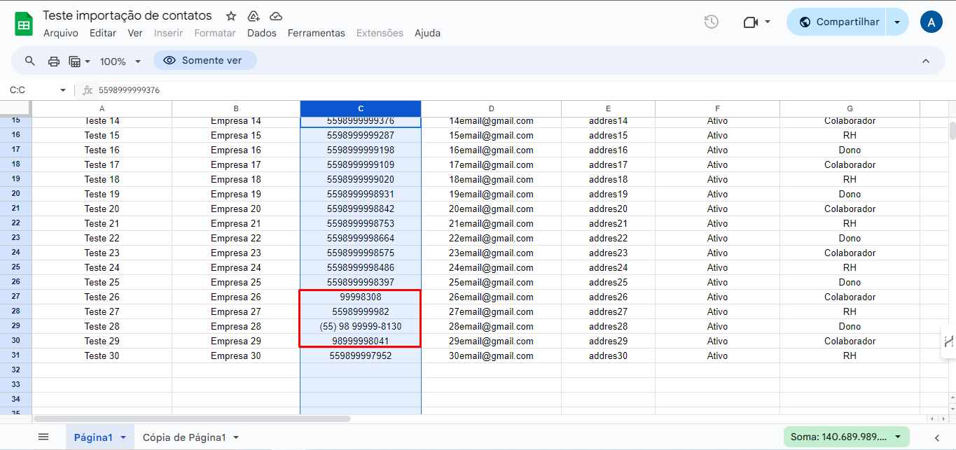 Por exemplo, números que não incluem o DDD, o código do país, que estão incompletos, e com símbolos podem resultar em erros durante a importação.