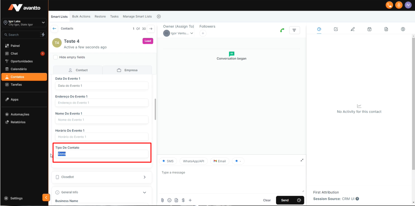 2.4 O campo personalizado "Tipo de Contato" já aparecerá atualizado caso a importação tenha sido feita corretamente.