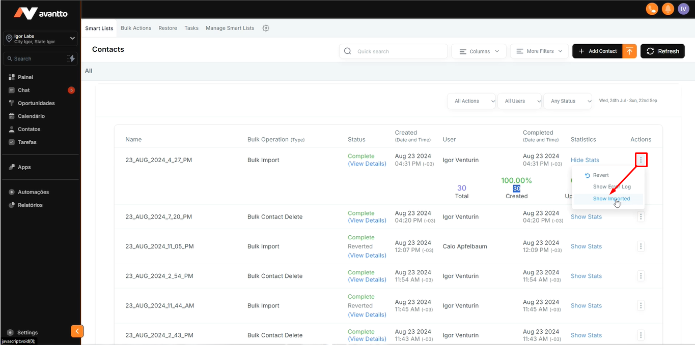 2.2 Clique em "Show Imported" para visualizar todos os contatos que foram importados.