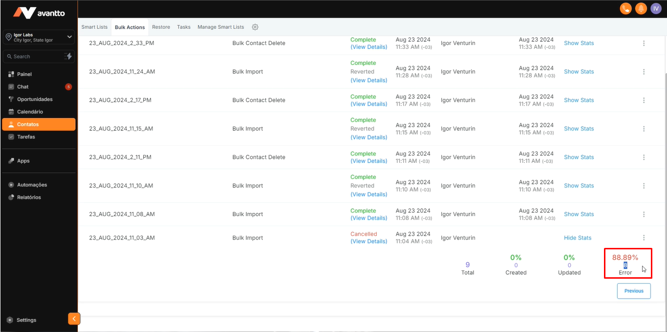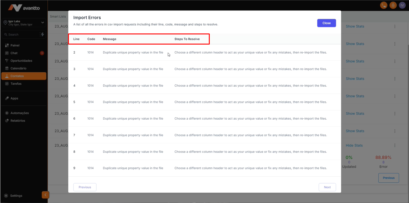 2.5 Para visualizar os erros, siga o mesmo procedimento do passo 2.2; no entanto, clique em "Show Error Log". Isso permitirá que você identifique e analise os problemas ocorridos durante a importação dos contatos.