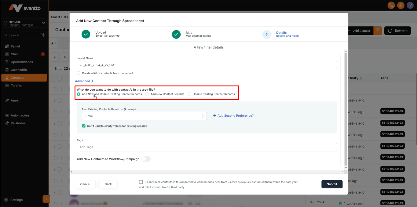 Em "What do you want to do with contacts in the .csv files?", se você deseja adicionar novos contatos e atualizar os já existentes, selecione a opção "Add New and Update Existing Contact Records".