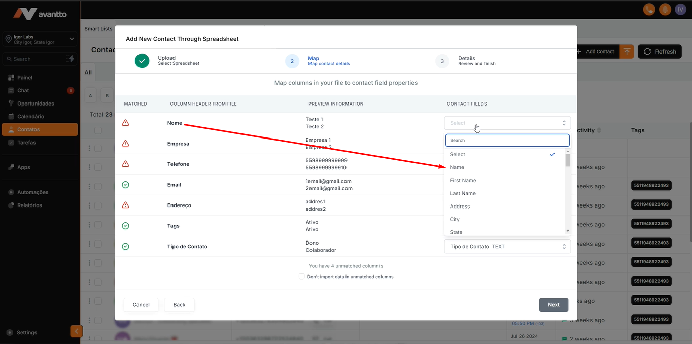 1.3 Nesta aba, você irá conectar os campos da planilha aos campos da Avantto.