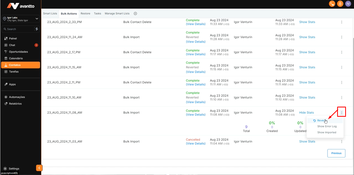 2.7 Caso você tenha adicionado muitos contatos ou se a lista importada estiver incorreta, e deseja remover todos de uma vez, basta clicar em "Reverter", conforme mostrado na imagem. Isso fará com que todos os contatos importados sejam excluídos.