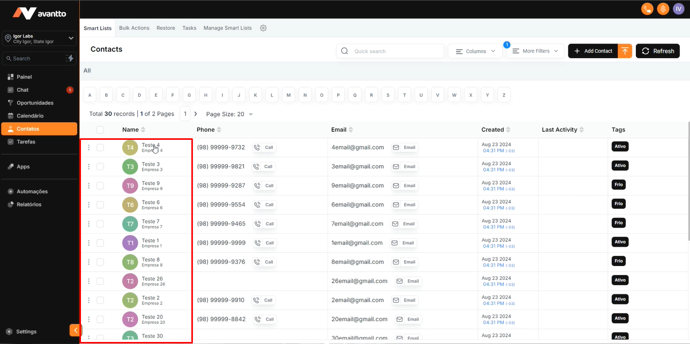 Nesta seção, você poderá filtrar esses contatos conforme necessário, facilitando a gestão e a organização da sua lista.