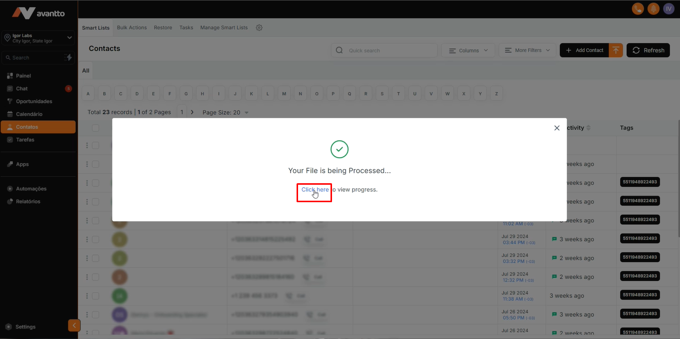 2.1 Ao finalizar a importação, é recomendável clicar em "Click Here" para verificar o progresso. Nesta seção, você poderá identificar se houve algum erro e confirmar se todos os contatos foram importados corretamente.