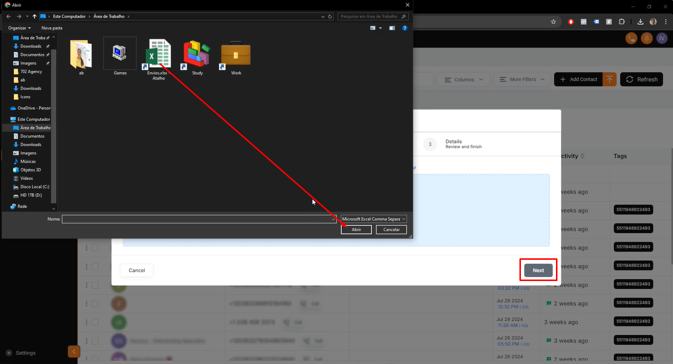 1.2 Após clicar em "Import Contacts", selecione "Upload a File" para escolher o arquivo que contém a lista de contatos. Lembre-se de que o arquivo deve estar no formato CSV. Depois de selecionar o arquivo, clique em "Next" para prosseguir.
