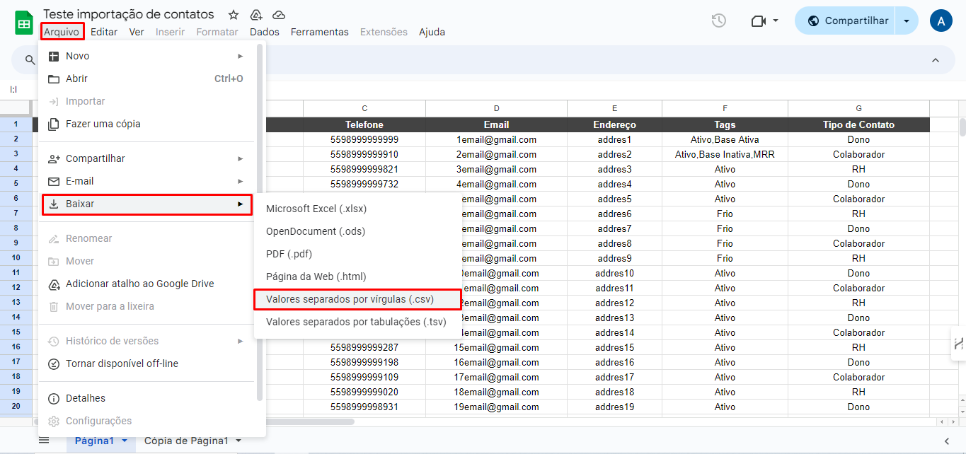 Ao realizar o download, é importante que o arquivo seja exportado no formato .CSV, pois este é o único aceito pela plataforma, com um limite de até 50 MB. Você pode utilizar o Google Sheets ou Excel para tratar esses dados; no entanto, o Google Sheets oferece uma interface mais simplificada para download e formatação.