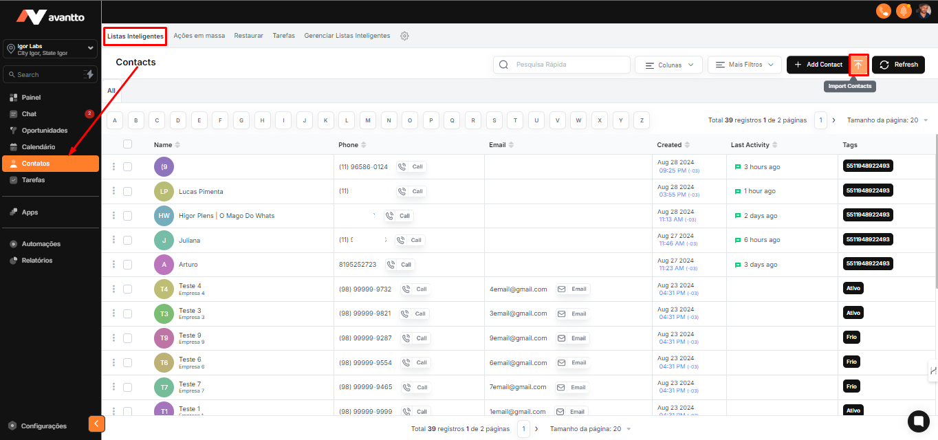 1.1 Para iniciar, acesse o menu lateral esquerdo e clique em Contatos na opção de smart list/lista inteligente. Em seguida em "Import Contacts" no canto superior direito.
