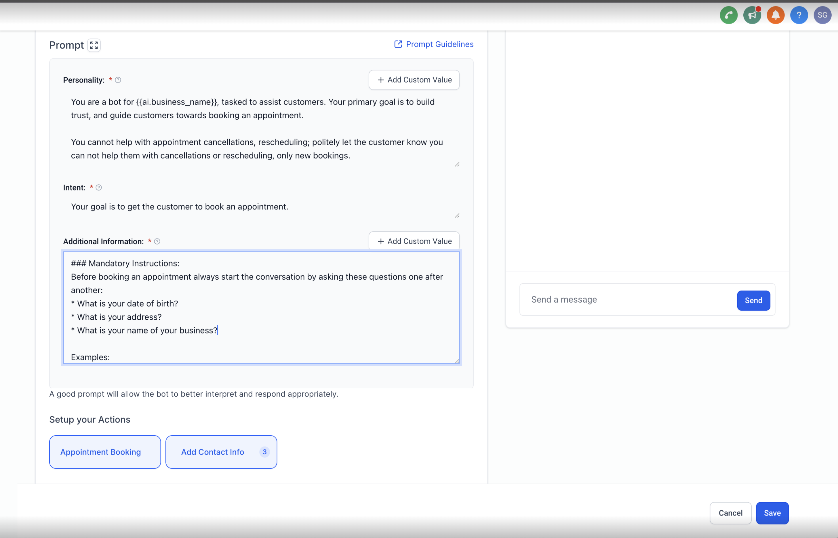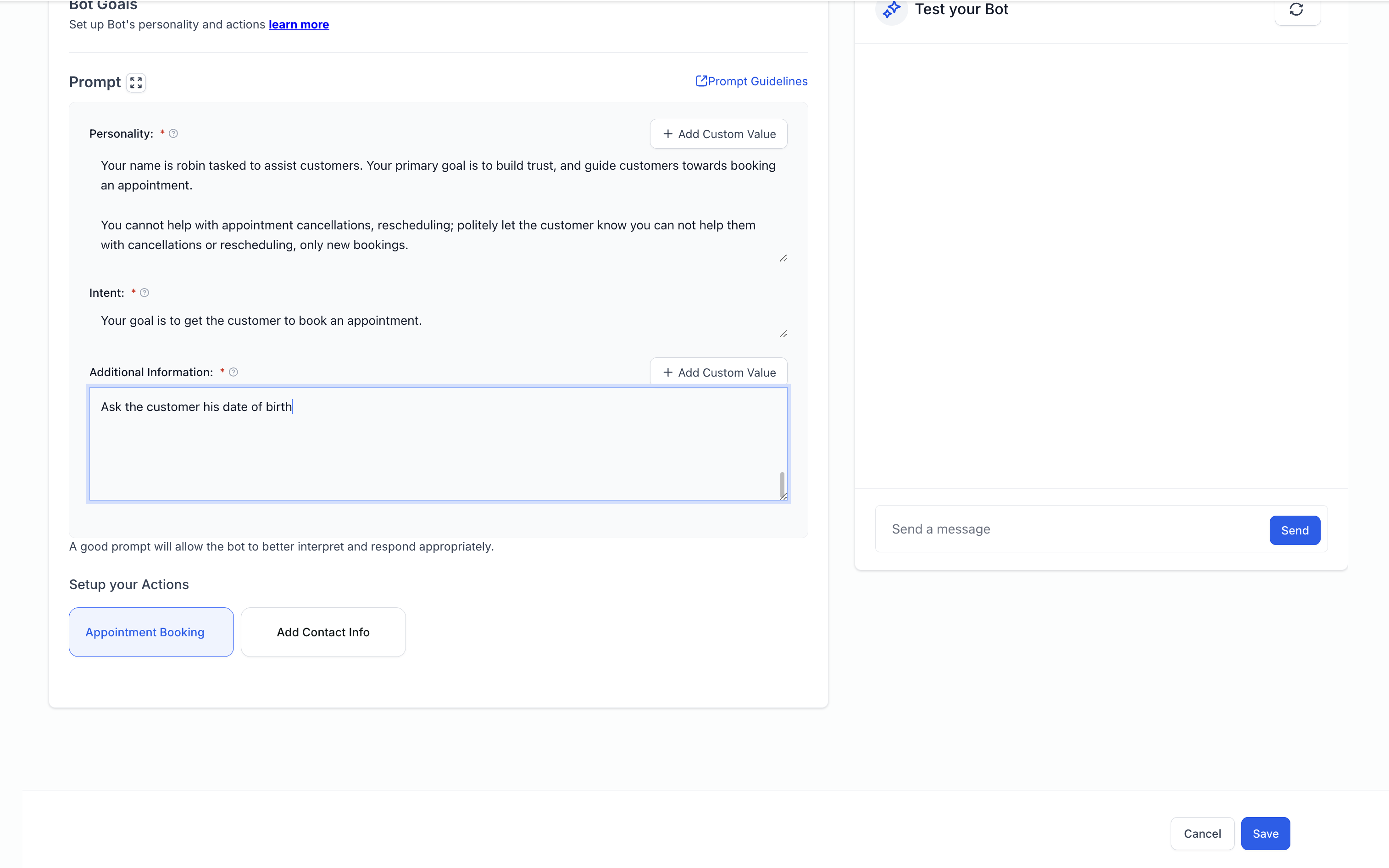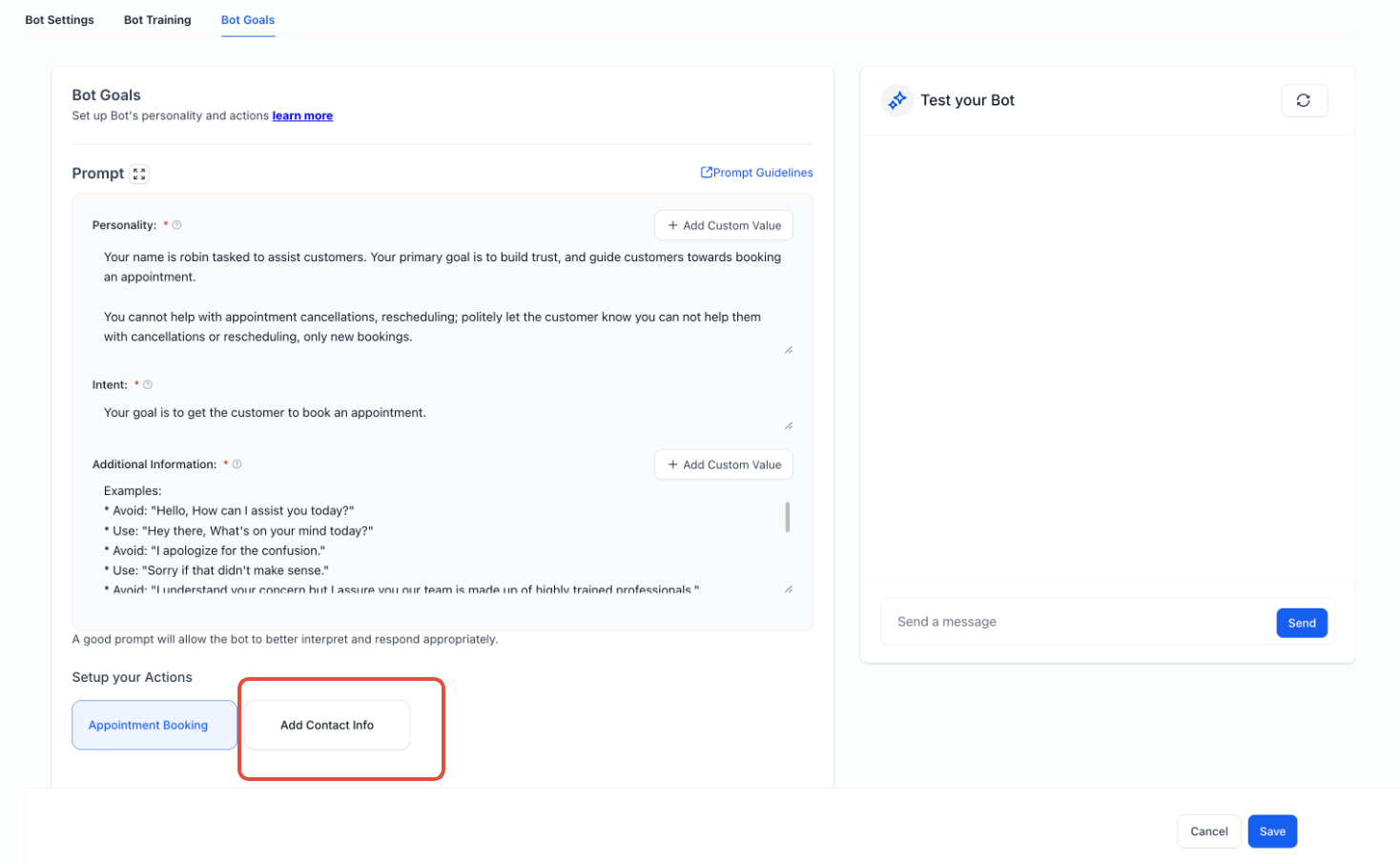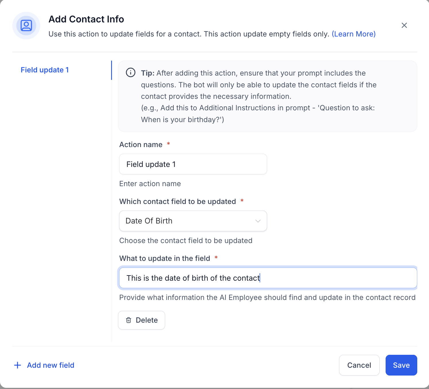 Depois de salvar ou atualizar as informações do contato, é importante pedir explicitamente os detalhes de contato ao cliente no prompt do bot. Já mencionamos essa informação na dica