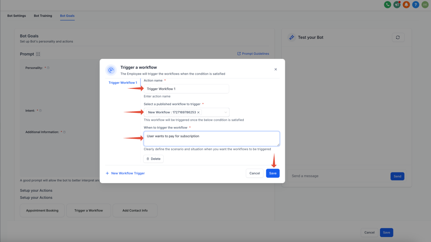 Ao definir condições de gatilho como "Cliente deseja pagar por uma assinatura" ou "Cliente deseja marcar um compromisso", garanta que o prompt seja escrito de forma que: