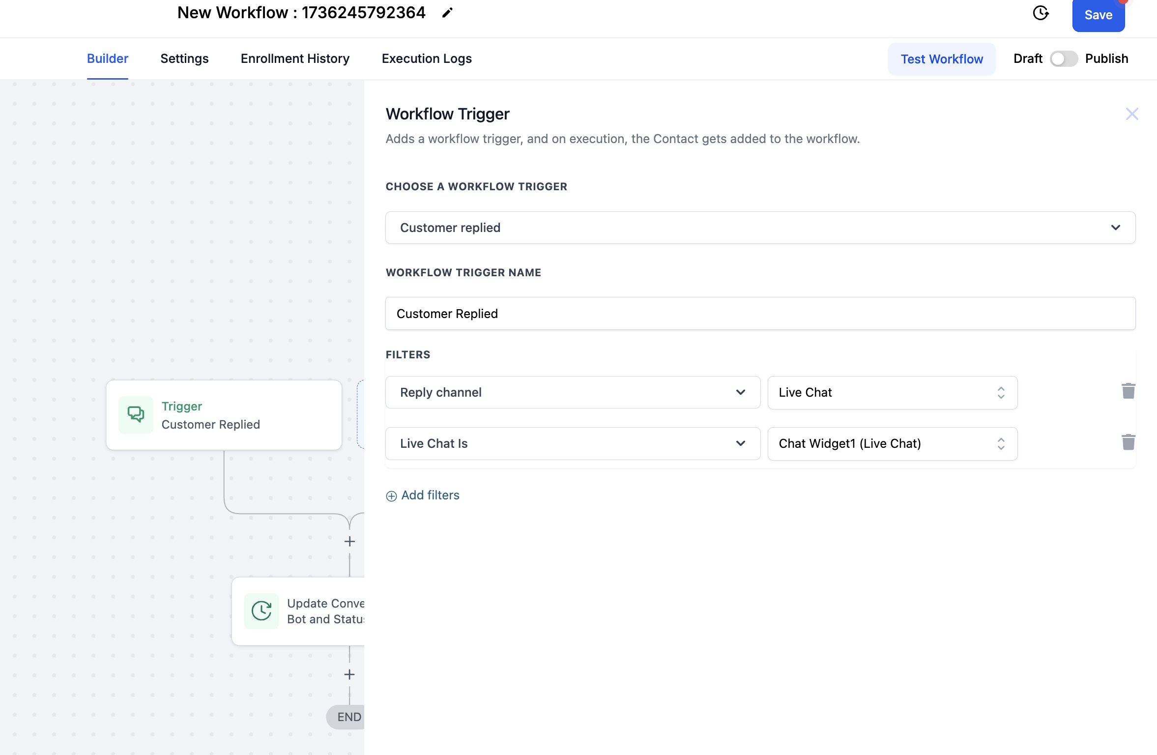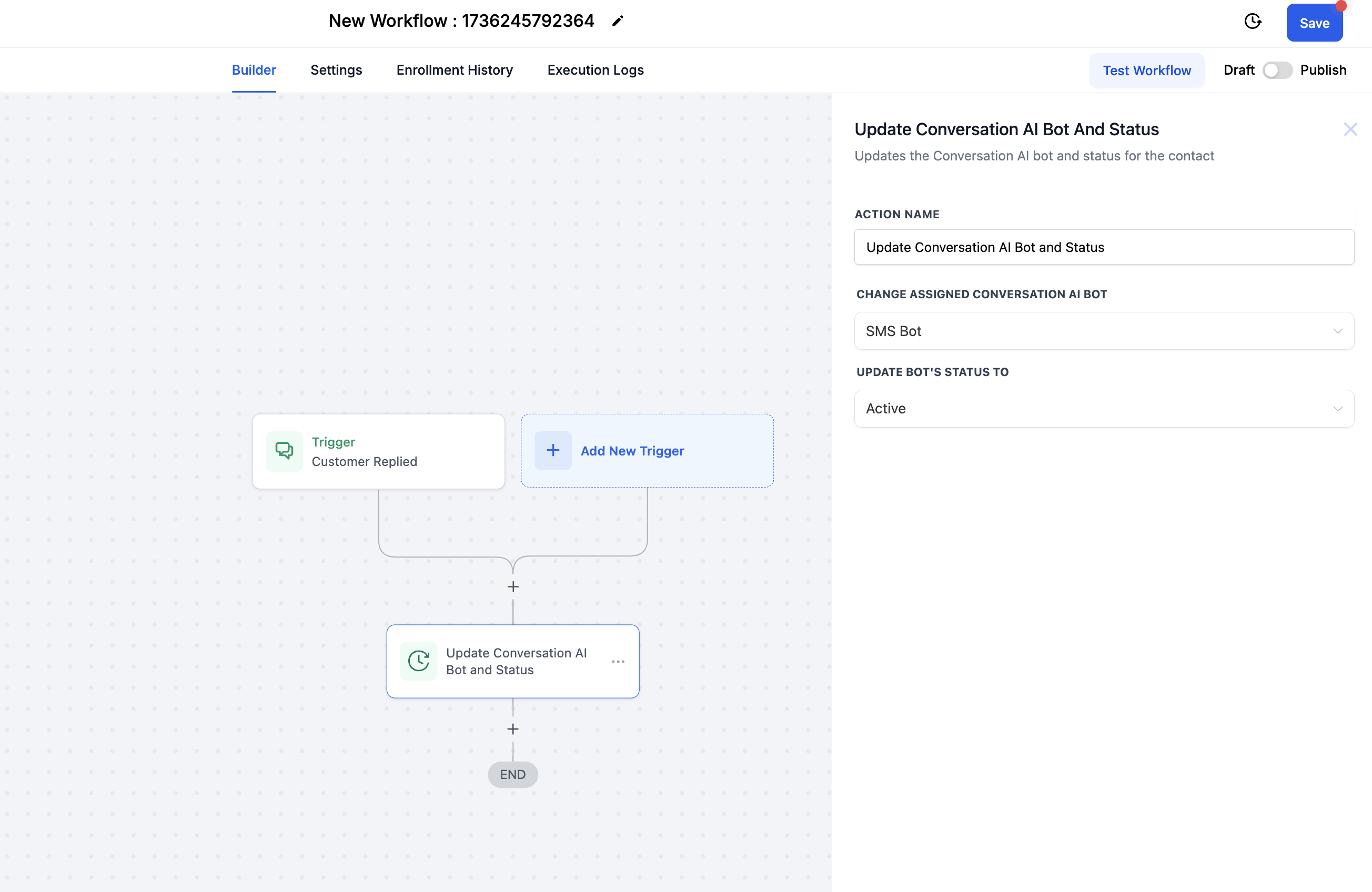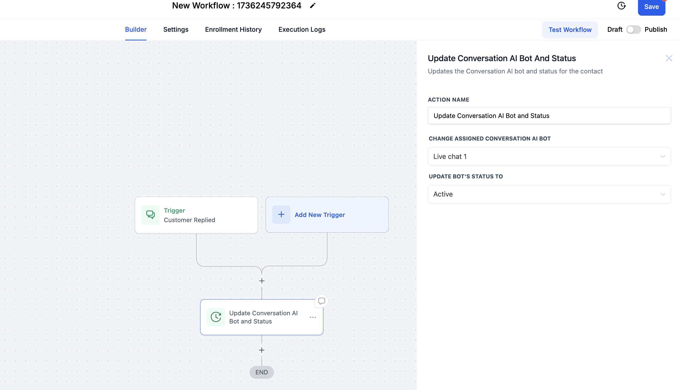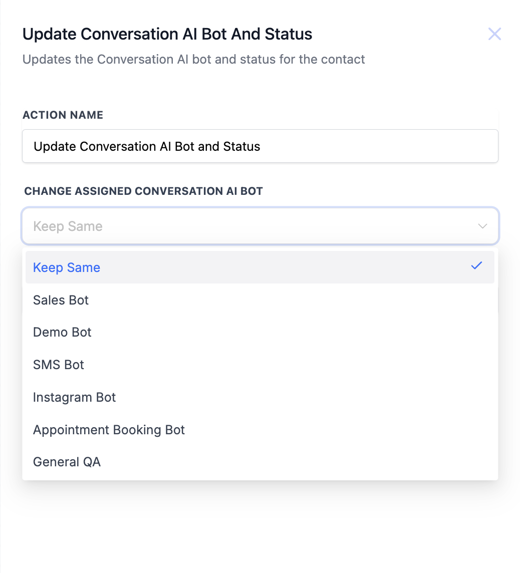 Adicione a ação: Atualizar Bot de Conversa AI e Status.