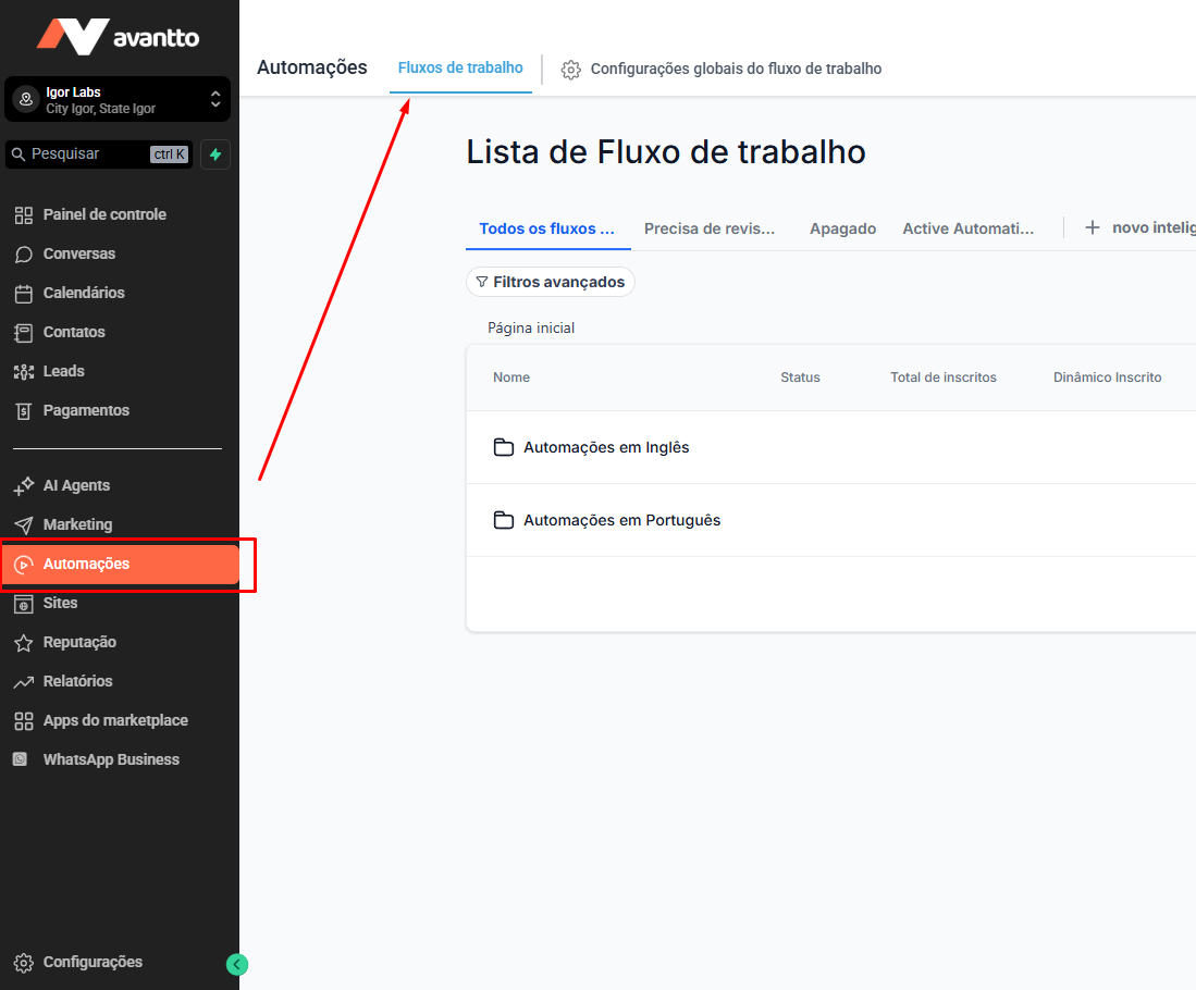 Vai na "Workflows" dentro da seção "Automação" do seu CRM.