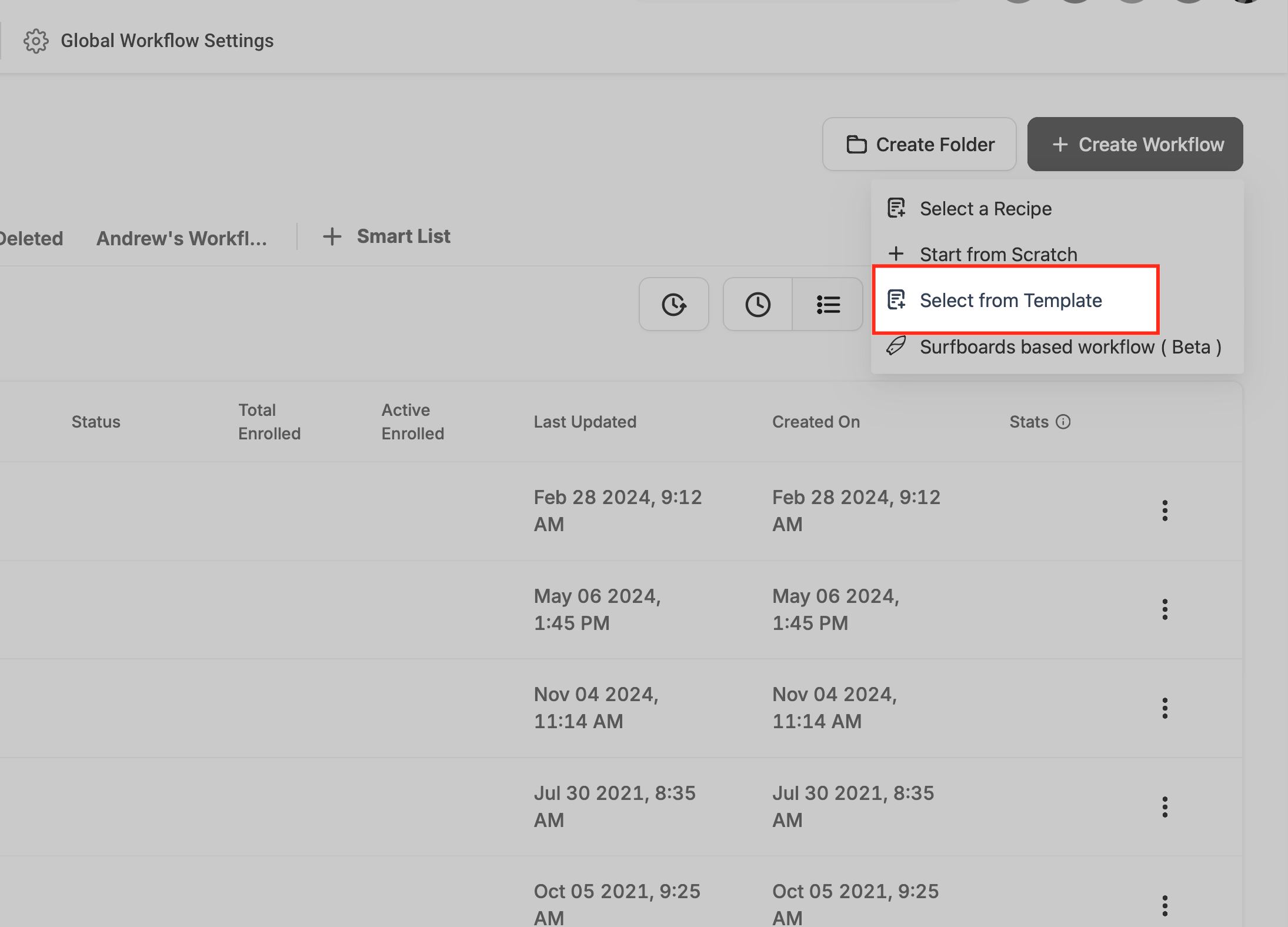 Use nossos modelos prontos pra criar seu workflow. Clique na opção "Selecionar do Modelo" pra ver a biblioteca de modelos.