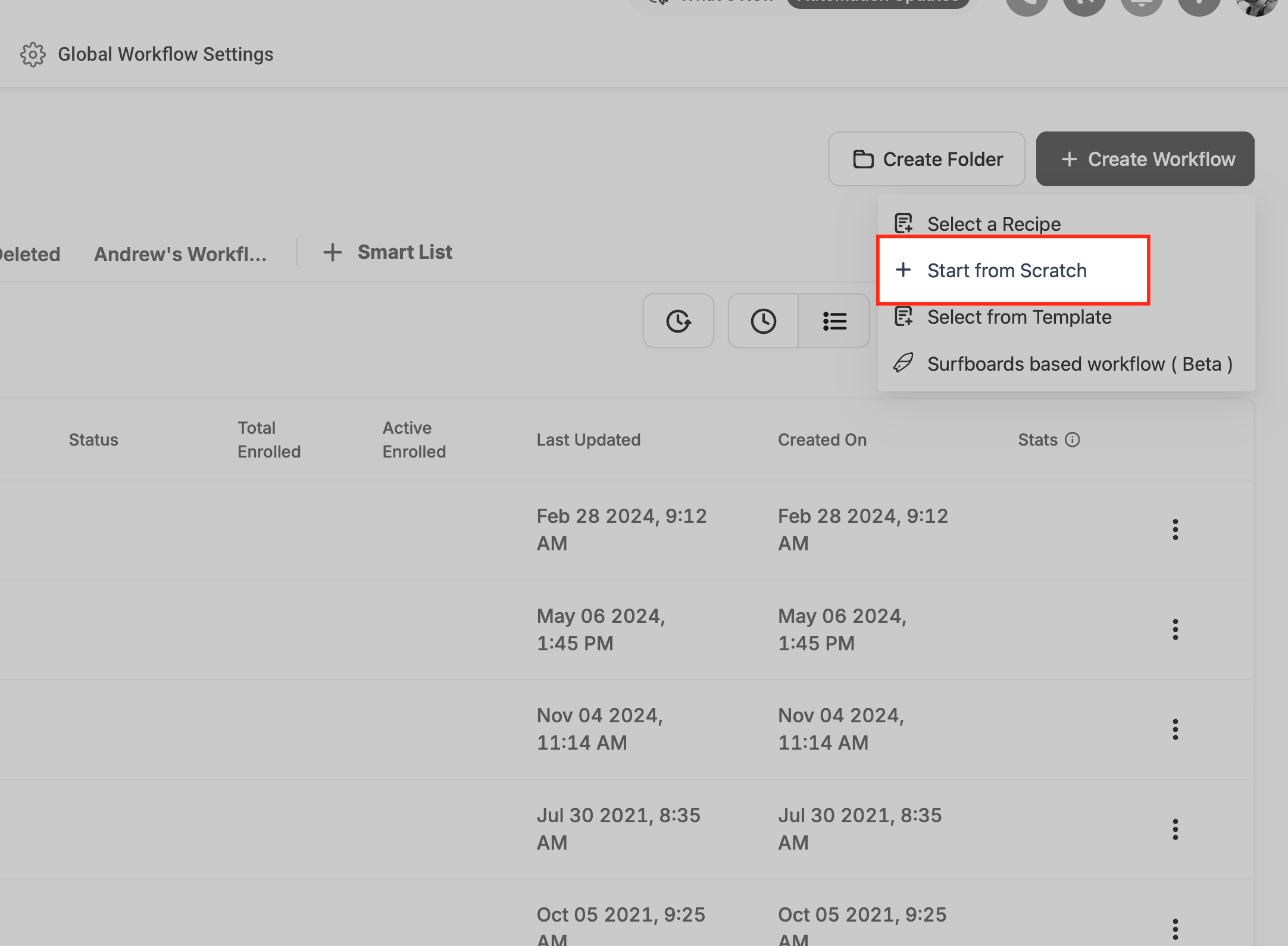 Ao criar um novo fluxo, você pode começar do zero, usar modelos prontos ou receitas existentes.