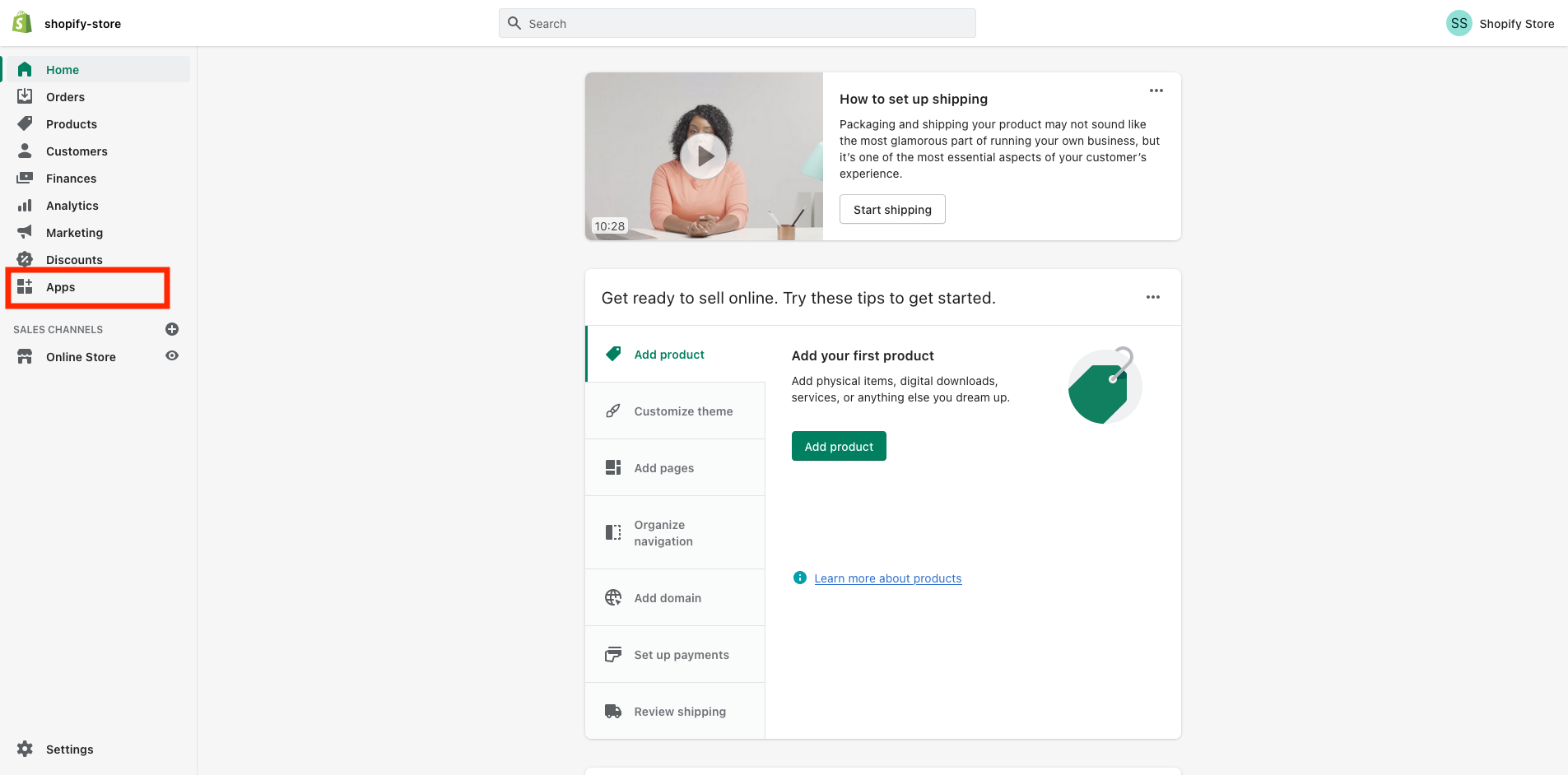 1.1 Faça login na sua loja Shopify e clique em "Apps" no seu painel
