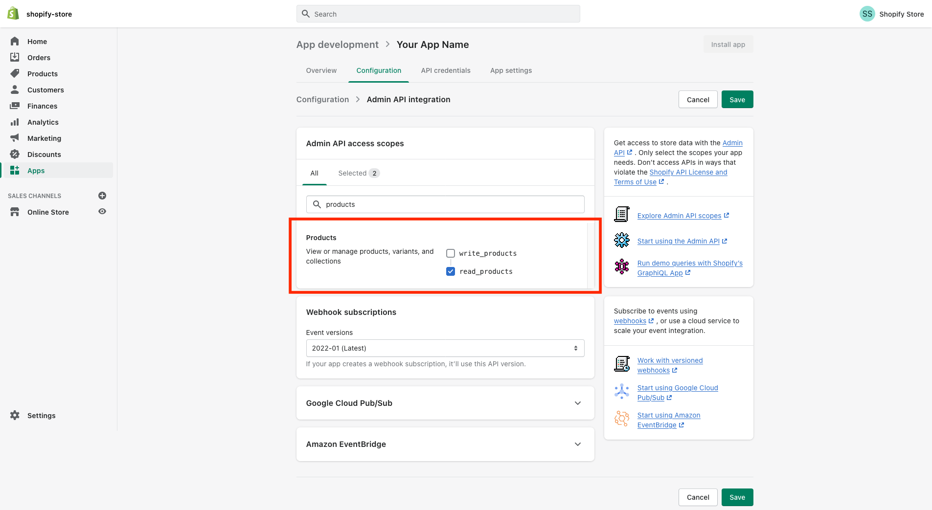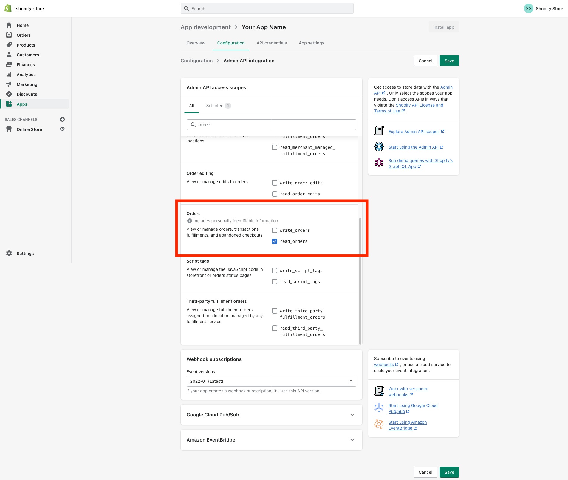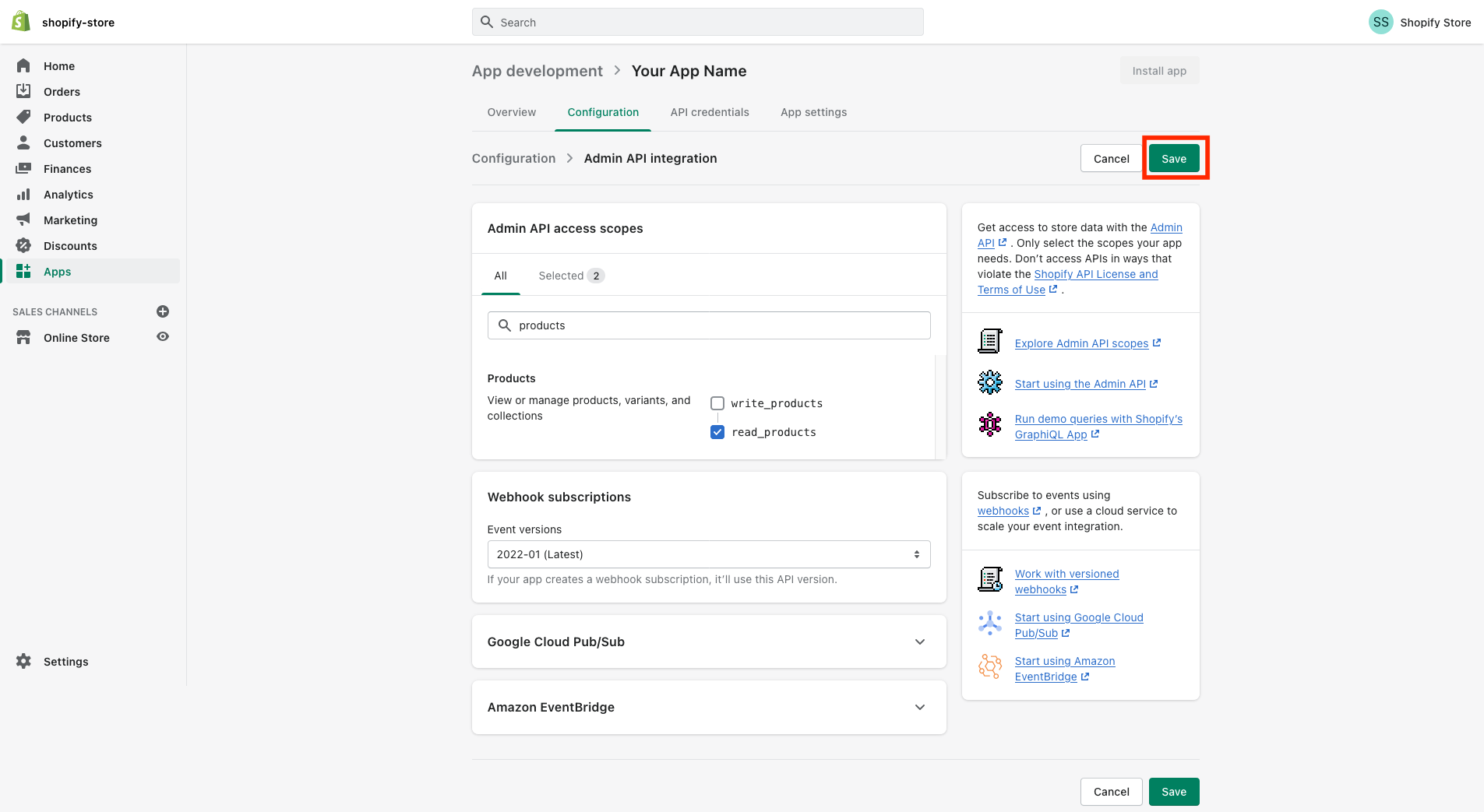 1.11 Depois que você ativar o acesso de leitura em "Orders and Product", salva o app clicando no