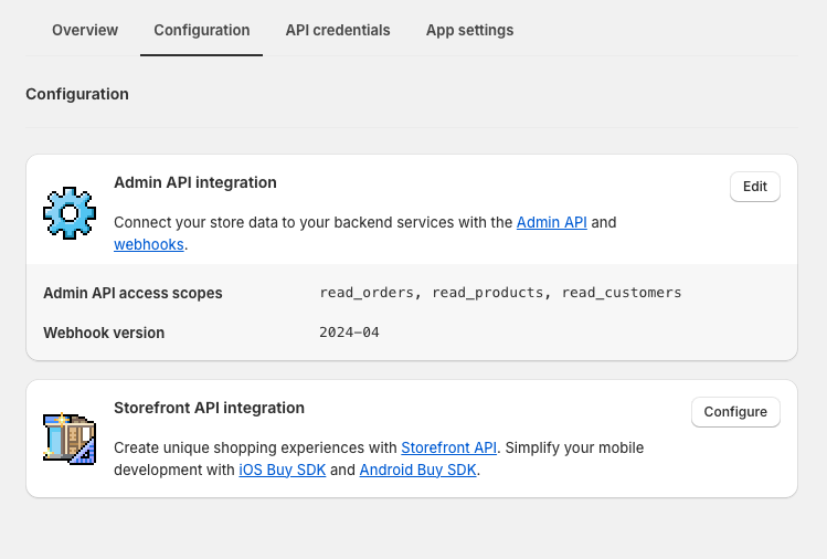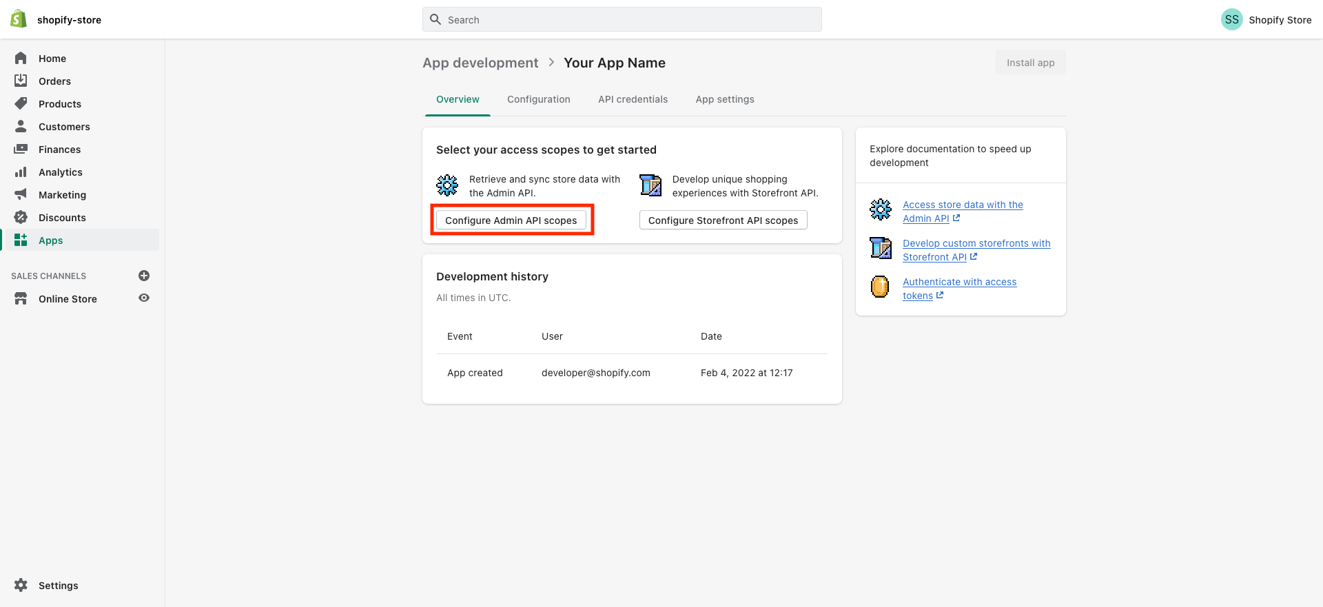 1.7 Depois, clica em "Configure Admin API scopes" para configurar a integração da Admin API