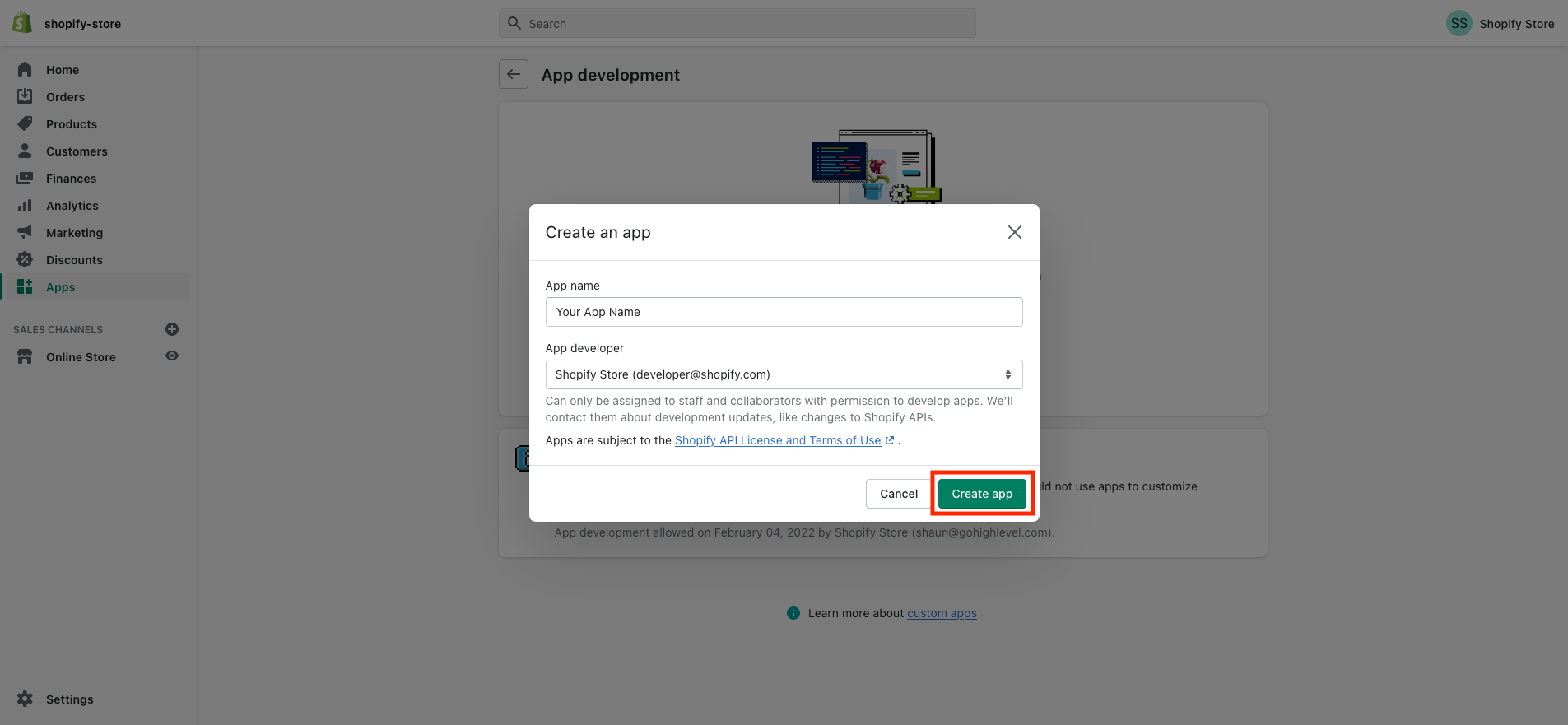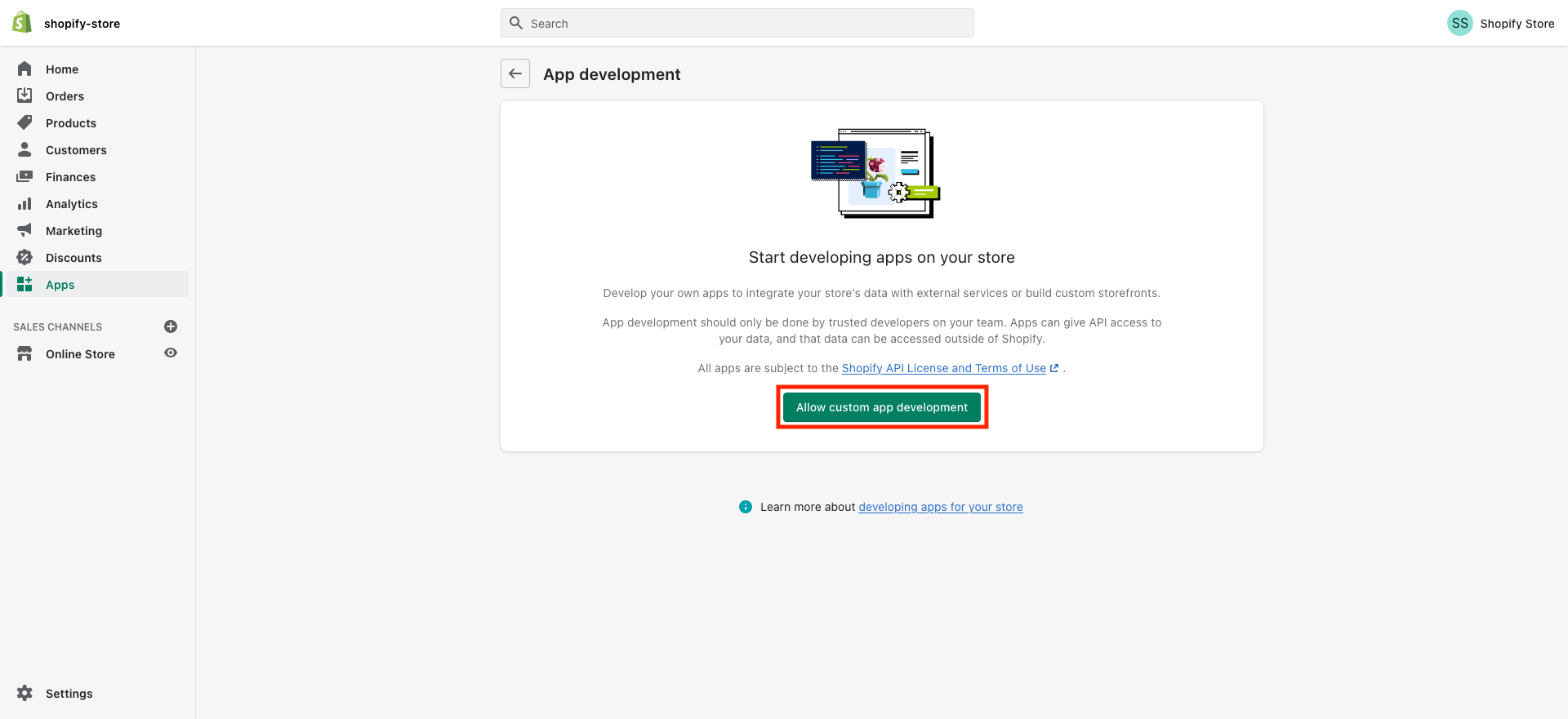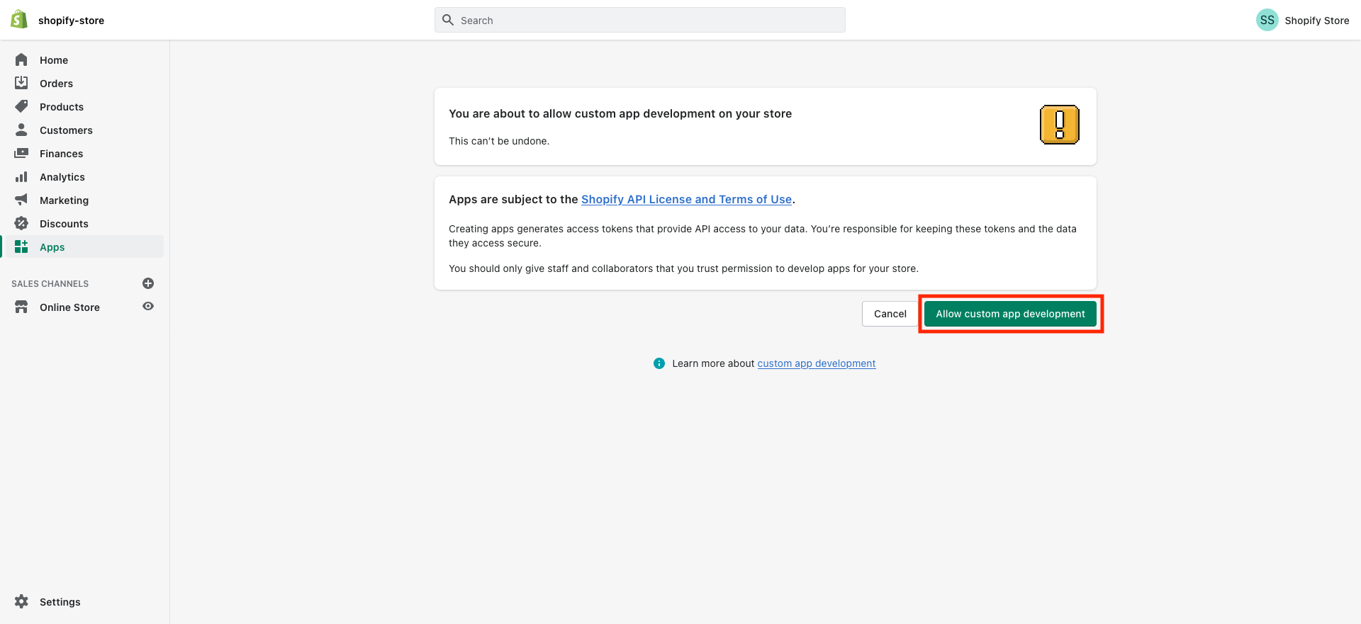 1.3 Depois, clica em "Allow custom app development" (se você já tiver liberado essa permissão então o Shopify