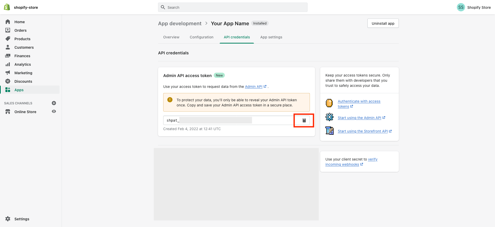 1.14 Copia o "token de acesso à Admin API" clicando no ícone da área de transferência